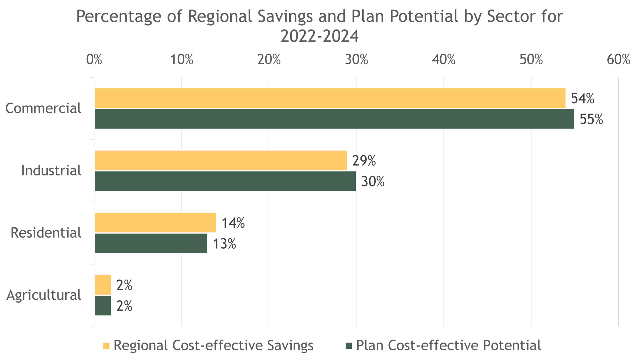 More than half of the savings from the first three years of the plan period have come from the commercial sector, followed by industrial and residential sectors programs respectively. The graph shows a comparison of the Plan’s potential by sector for 2022-2024 to the regional savings achieved during the same time period. This shows close alignment in where the Plan anticipated savings to occur and the sectors in which the region is capturing cost-effective savings.